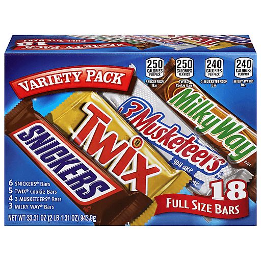 Keep your guests smiling and satisfied with a variety pack of SNICKERS Milk Chocolate Bars, TWIX Caramel Chocolate Bars, MILKY WAY Milk Chocolate Bars and 3 MUSKETEERS Milk Chocolate Bars Bulk Candy Assortment. Put these individually wrapped assorted chocolates out in a bowl during a movie or sporting event, pack them in school lunches or fill up the office candy bowl to give co-workers a treat. This 18 full-sized candy bars of assorted chocolates features individually wrapped, bite-size SNICKERS, TWIX, 3 MUSKETEERS and MILKY WAY Candy Bars. Great for filling pinatas and filling Christmas stockings, this milk chocolate variety pack has 18 pieces of delicious candy to keep the fun going. Try incorporating different chocolate candy flavors into your baking projects to create uniquely delicious treats. Add a few SNICKERS & 3 MUSKETEERS milk chocolate candy bar pieces to your ice cream sundae or top your brownies with a few MILKY WAY & TWIX caramel chocolate bars. Fill piñatas and dessert table candy bowls with minis-size candy for celebrations of all types. Stuff stockings, prepare Easter baskets, create Valentine's Day dessert recipes and fill Halloween candy bowls with a variety of minis-size chocolates. Add delicious fun to everyday celebrations and special events by adding this Chocolate Bar Variety Pack to your shopping list today!